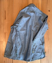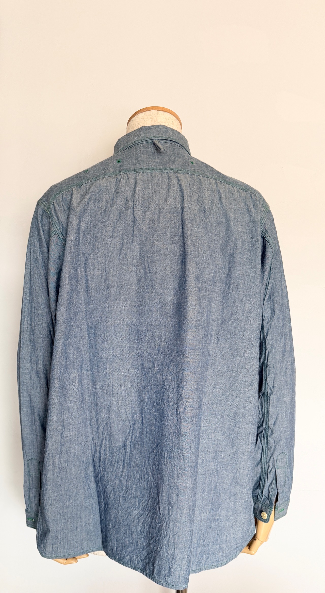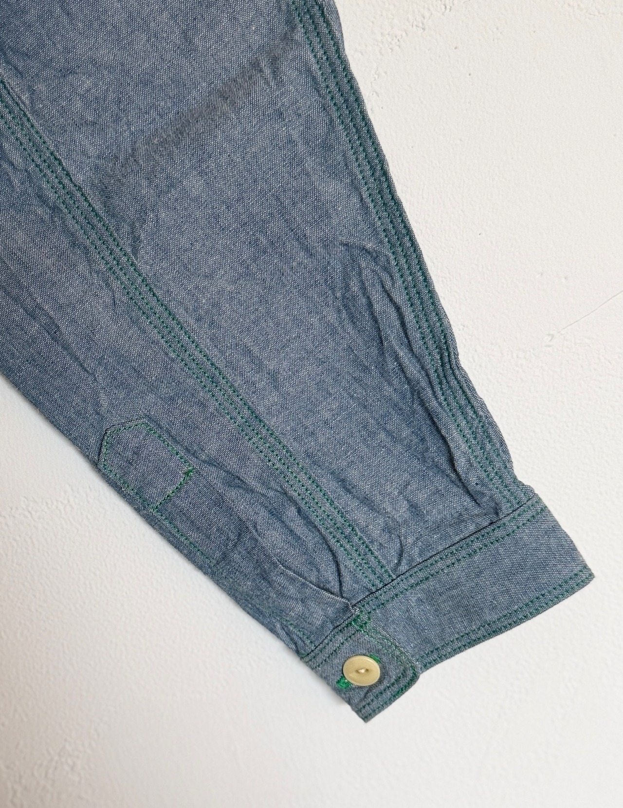 シャンブレーの色合いにグリーンのステッチがアクセントとなり、シンプルながらもおしゃれな印象を与えます。日常使いにぴったりの一着をお楽しみください!