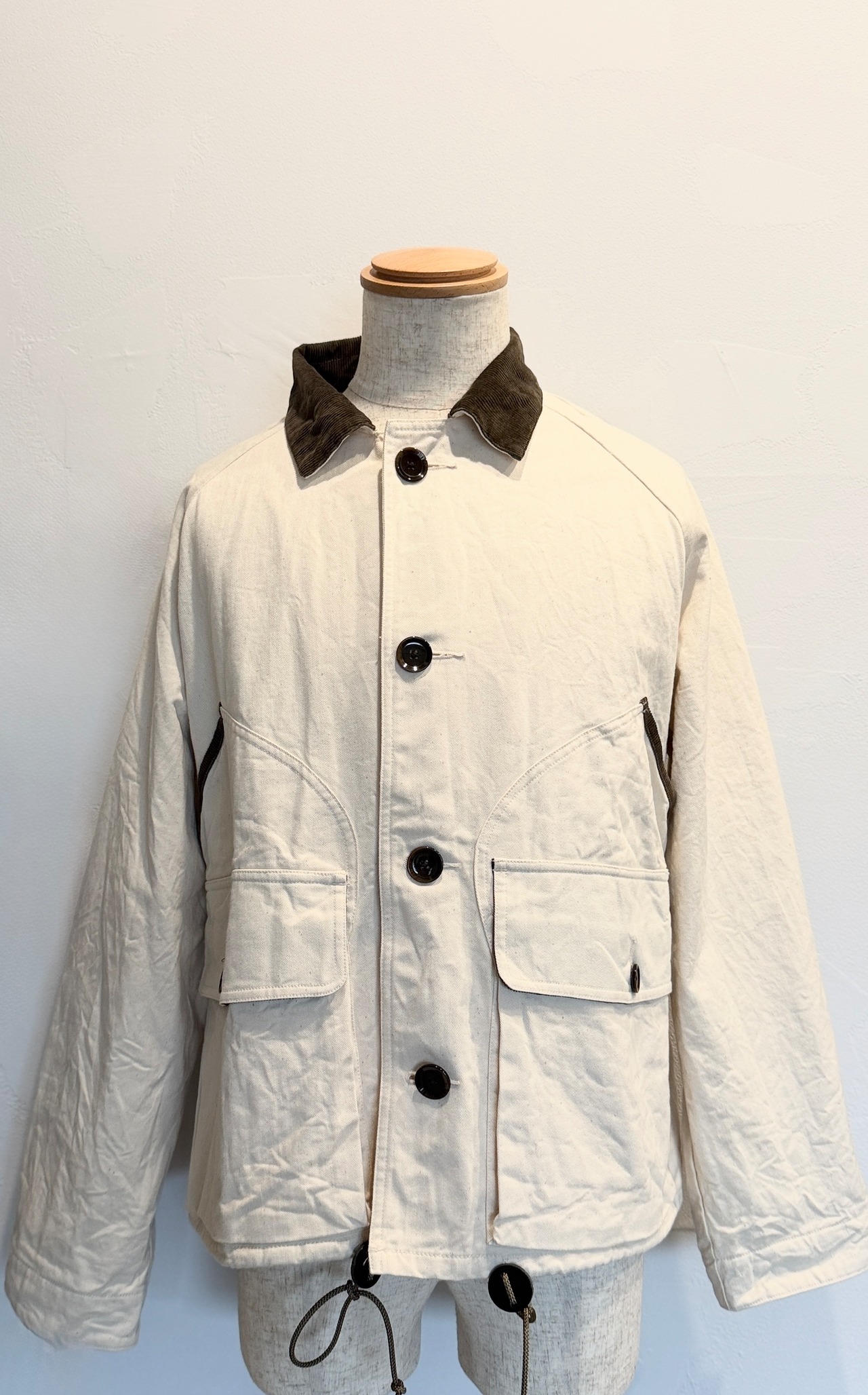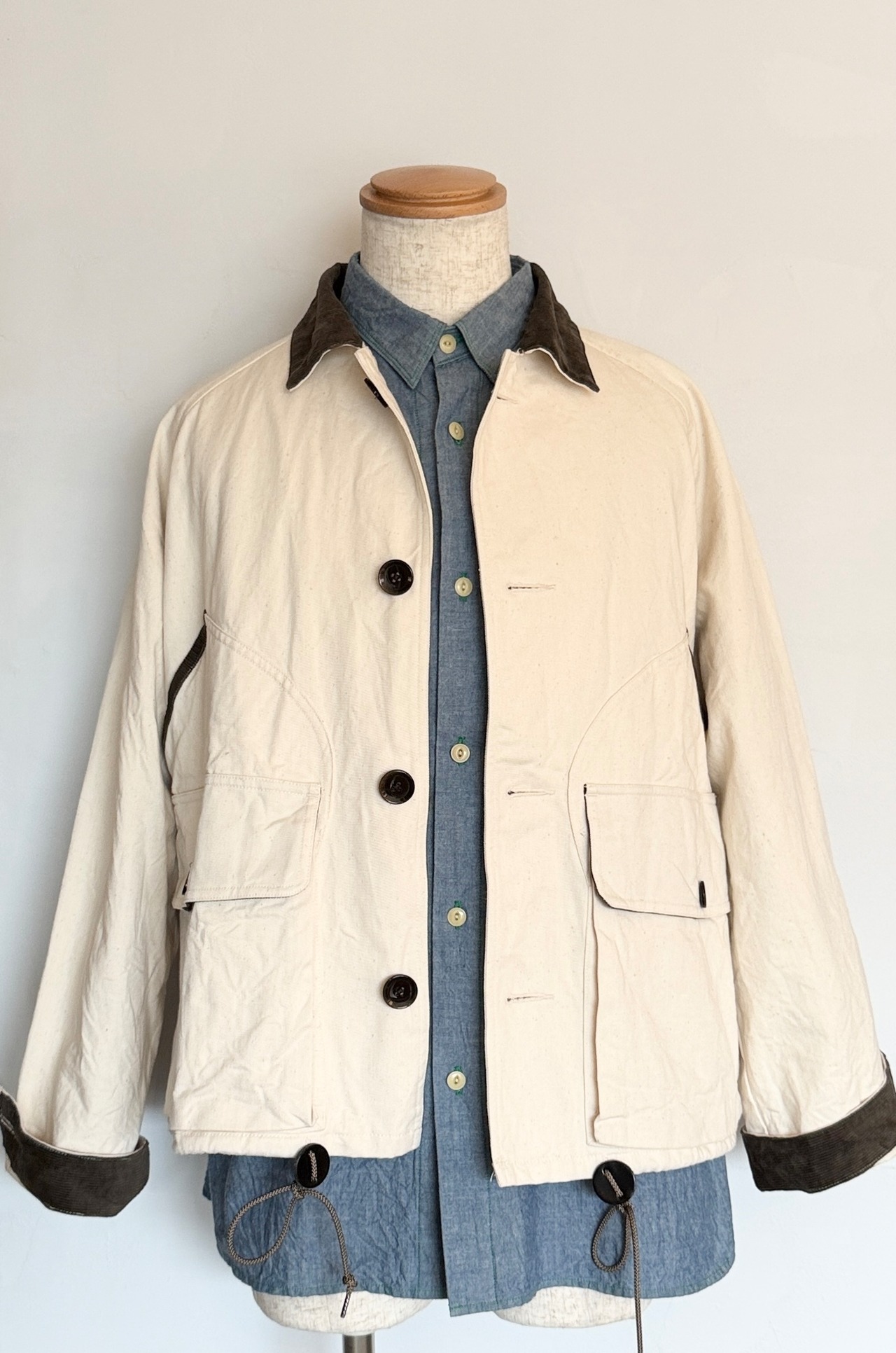 襟、ポケットのフチやカフス部分のコーデュロイがアクセントになっていています。